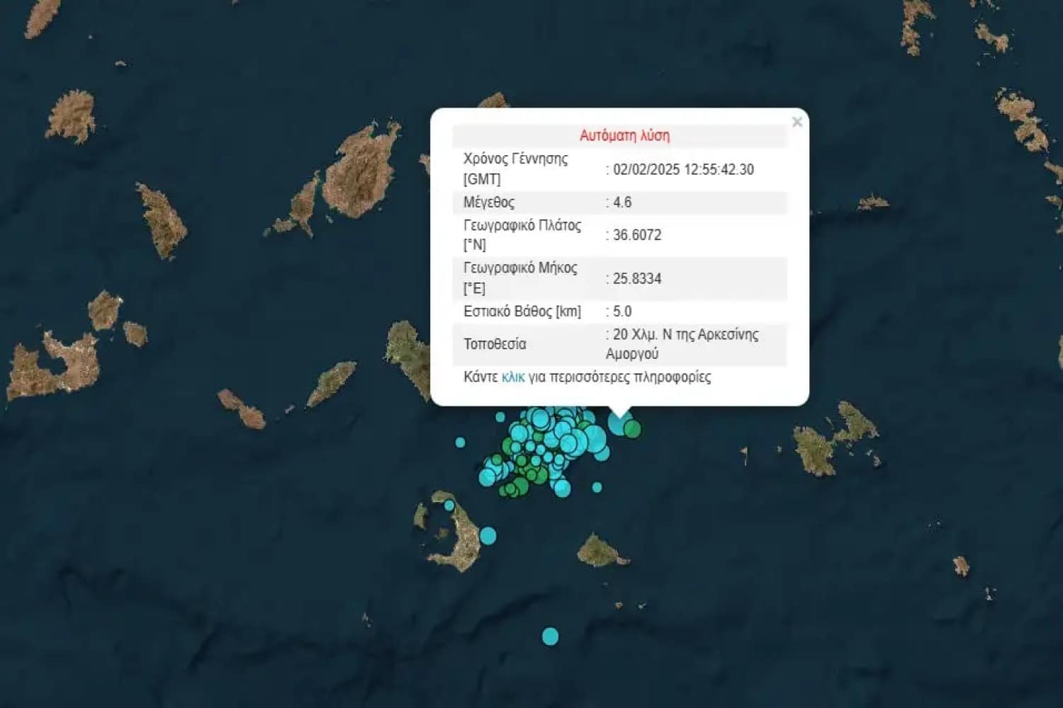 Ένας νέος σεισμός μεγέθους 4,6 Ρίχτερ σημειώθηκε στις 14:55 ανοιχτά της Σαντορίνης κοντά στην Αμοργό.