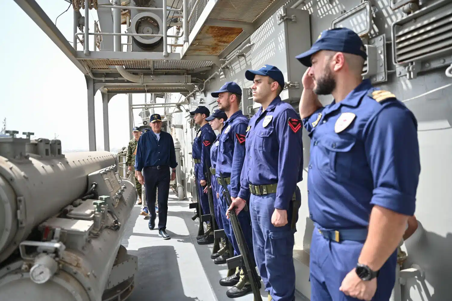 Τον υπουργό Εθνικής Άμυνας και τον Ευρωπαίο αξιωματούχο συνόδευαν ο Αρχηγός ΓΕΕΘΑ στρατηγός Δημήτριος Χούπης και ο Αρχηγός ΓΕΝ αντιναύαρχος Δημήτριος – Ελευθέριος Κατάρας.