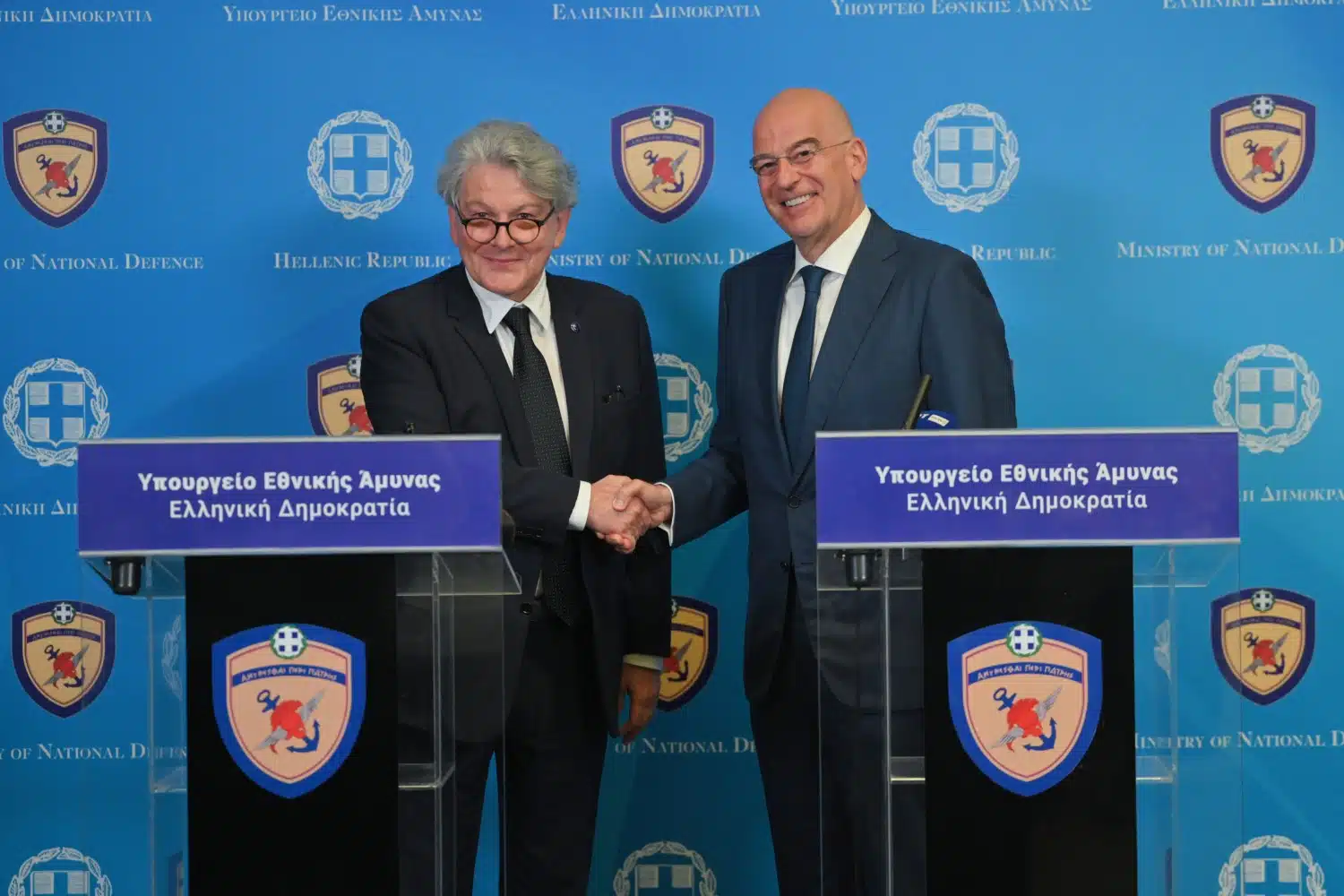 Ο υπουργός Εθνικής Άμυνας Νίκος Δένδιας, υποδέχθηκε σήμερα (19/6), στο υπουργείο Εθνικής Άμυνας, τον Επίτροπο Εσωτερικής Αγοράς της Ευρωπαϊκής Ένωσης Thierry Breton, αρμόδιο μεταξύ άλλων για την ενδυνάμωση της τεχνολογικής ανεξαρτησίας, της τεχνητής νοημοσύνης, της αμυντικής και διαστημικής τεχνολογίας και κυβερνοασφάλειας, καθώς και για την ανάπτυξη του Κοινού Ταμείου Άμυνας.
