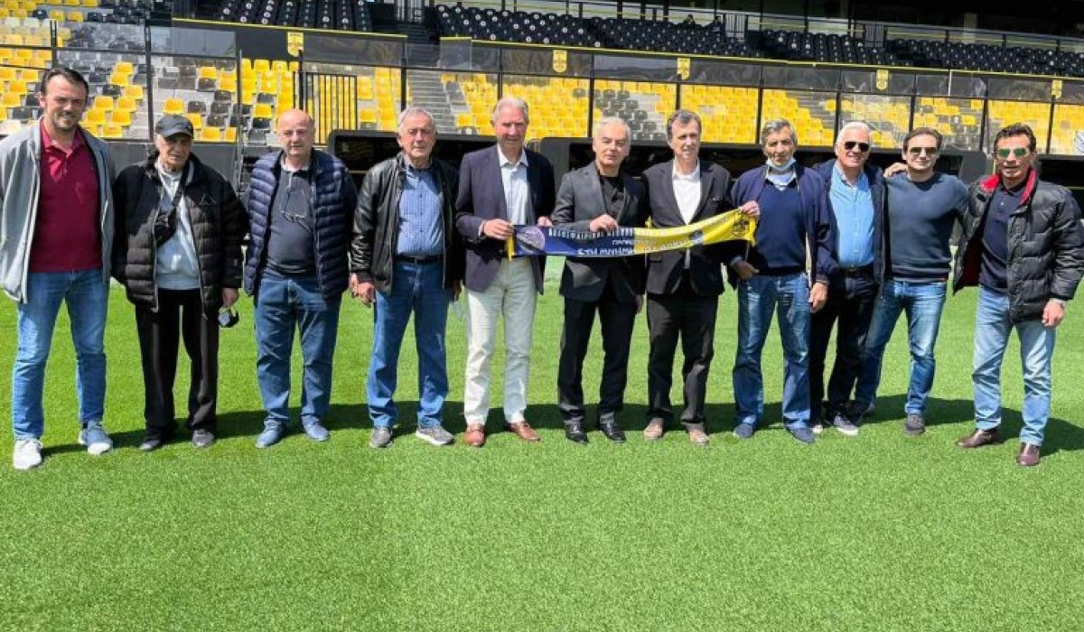 Η συνάντηση έγινε μέσα στον αγωνιστικό χώρο του Χαριλάου, με τους παλαίμαχους ποδοσφαιριστές να προσφέρουν στον Αριστείδη Καμπανό τα αναμνηστικά από το πρόσφατο φιλικό που έγινε στο Νέο Ηράκλειο της Αθήνας στη μνήμη του Άλκη.