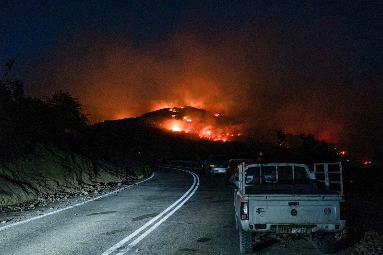 Ο κ. Λεβεντάκης είπε πως η φωτιά κατεβαίνει την πλαγιά που δεν έχει μεγάλη βλάστηση και έχει καεί δύο φορές στο παρελθόν. «Έχουν παραταχθεί δυνάμεις, έχει μέχρι και μπουλντόζα της πολεμικής αεροπορίας», στην πλαγιά.