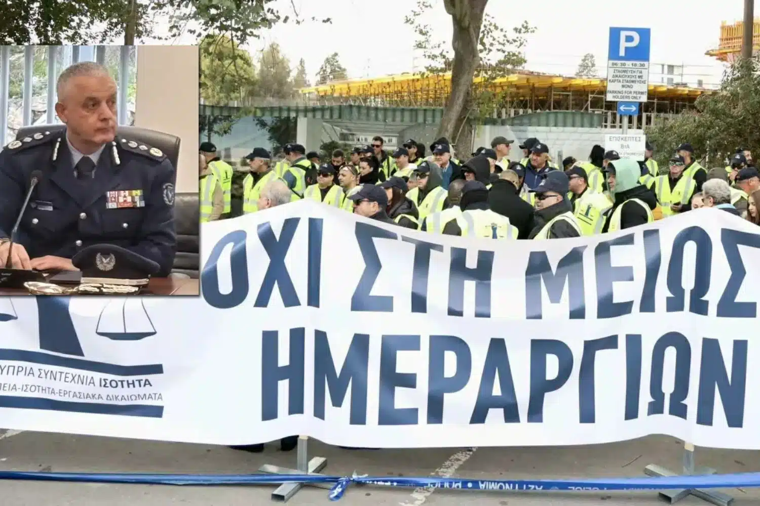 Τα μέλη του Κλάδου Αστυνομικού Σώματος της συντεχνίας «ΙΣΟΤΗΤΑ» συγκεντρώθηκαν λίγο πριν τις 09:00 έξω από τις εγκαταστάσεις της Βουλής των Αντιπροσώπων, κρατώντας πανό και φωνάζοντας συνθήματα.
