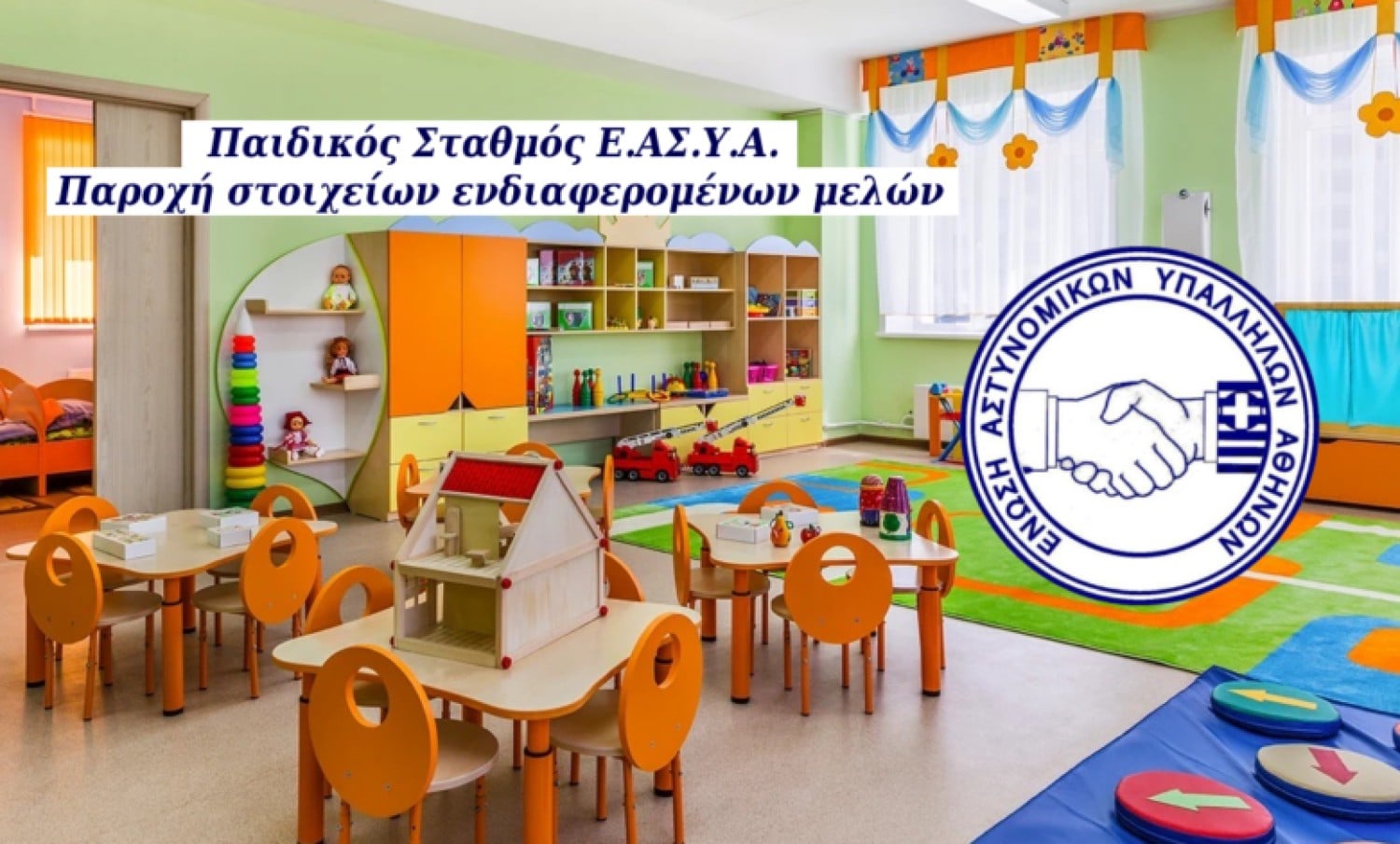 Όπως έχετε ενημερωθεί και από προηγούμενες ανακοινώσεις της Ένωσής μας, πρόσφατα δημιουργήθηκε τριμελής επιτροπή από μέλη του Δ.Σ. μας, με σκοπό τη μελέτη και την απόκτηση της απαραίτητης τεχνογνωσίας για την ίδρυση και λειτουργία παιδικών σταθμών για τα τέκνα των μελών της Ένωσης Αστυνομικών Υπαλλήλων Αθηνών.
