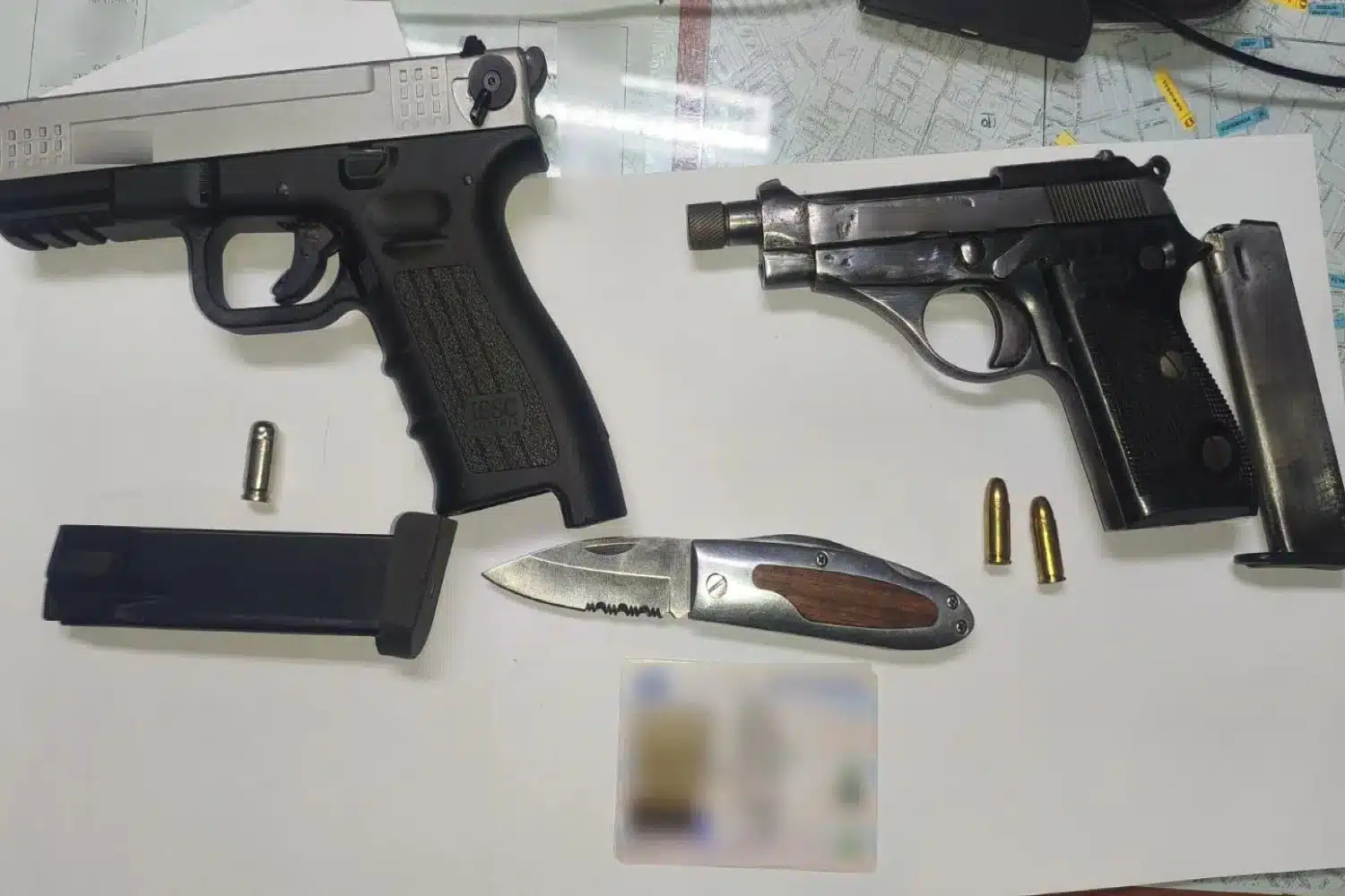 Κατά τον έλεγχο στο εσωτερικό του οχήματος βρέθηκαν και κατασχέθηκαν δύο πιστόλια με τρία φυσίγγια, δύο γεμιστήρες, ένας αναδιπλούμενος σουγιάς, καθώς και πλαστή άδεια ικανότητας οδήγησης, στην οποία είχε επικολληθεί φωτογραφία του ίδιου.