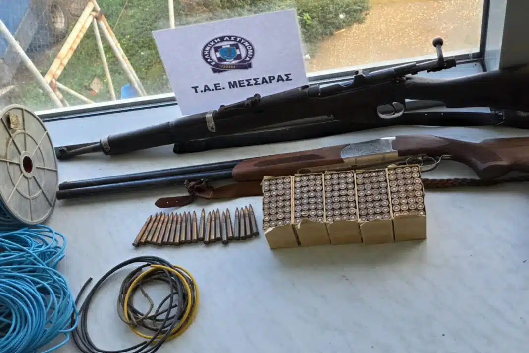 Εντός του ποιμνιοστασίου εντοπίστηκε πράσινη θήκη κυνηγετικού όπλου που περιείχε ένα πολεμικό τυφέκιο με κινητό ουραίο, του οποίου ο αριθμός σειράς είχε αλλοιωθεί, καθώς τμήμα του είχε αποκοπεί, αλλά και ένα δίκαννο κυνηγετικό όπλο μάρκας Verney–Carron, με πλήρως αποξεισμένο αριθμό.