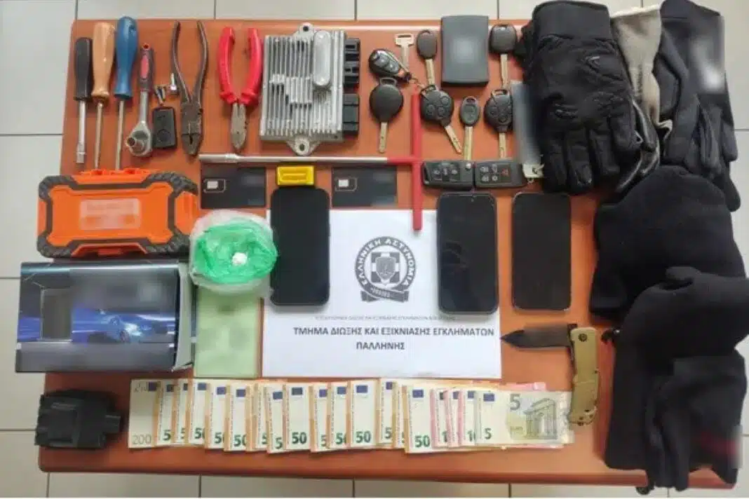 Από έρευνες του Τμήματος Δίωξης και Εξιχνίασης Εγκλημάτων Παλλήνης κατασχέθηκαν, μεταξύ άλλων, πλήθος διαρρηκτικών εργαλείων και κλειδιών οχημάτων, συσκευή προγραμματισμού κλειδιών μοτοσυκλετών και συσκευή γεωεντοπισμού (GPS).