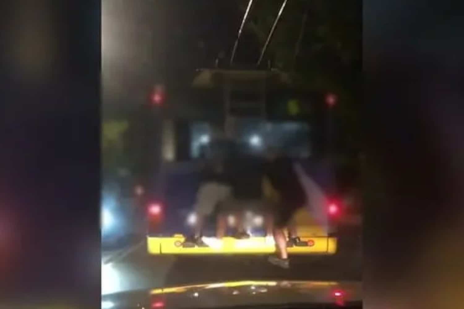 Στο τρόλεϊ, καθώς ήταν ακινητοποιημένο στο φανάρι στα Πατήσια, φαίνονται να ανεβαίνουν οι ανήλικοι και να κρέμονται στη σκάλα, με αποτέλεσμα να κινδυνεύσουν να πέσουν και να τραυματιστούν σοβαρά.