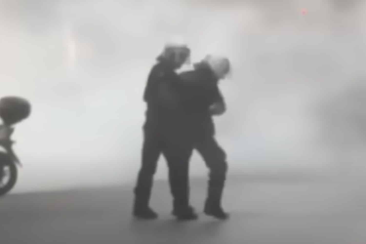 Την ώρα που η ατμόσφαιρα είχε ήδη γίνει αποπνικτική από τα δακρυγόνα, ένας άνδρας των ΜΑΤ φαίνεται να ζητά εξηγήσεις από συνάδελφό του και, μέσα σε λίγα δευτερόλεπτα, να του επιτίθεται χτυπώντας τον, αφήνοντας άναυδους όσους παρακολουθούσαν τη σκηνή.