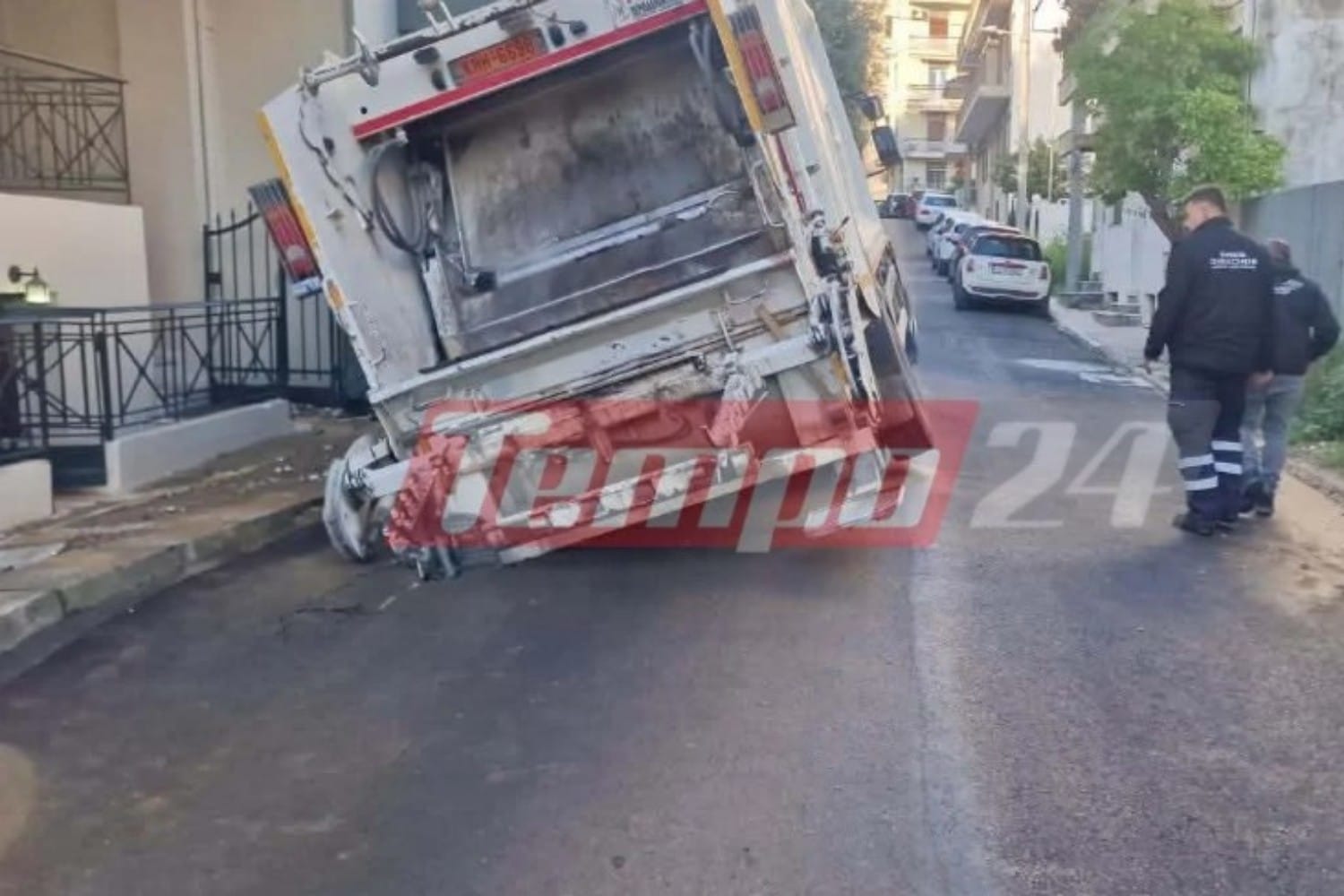 Γερανός έσπευσε στο σημείο για να σηκώσει το απορριμματοφόρο, ενώ θα επέμβει και η ΔΕΥΑΠ.