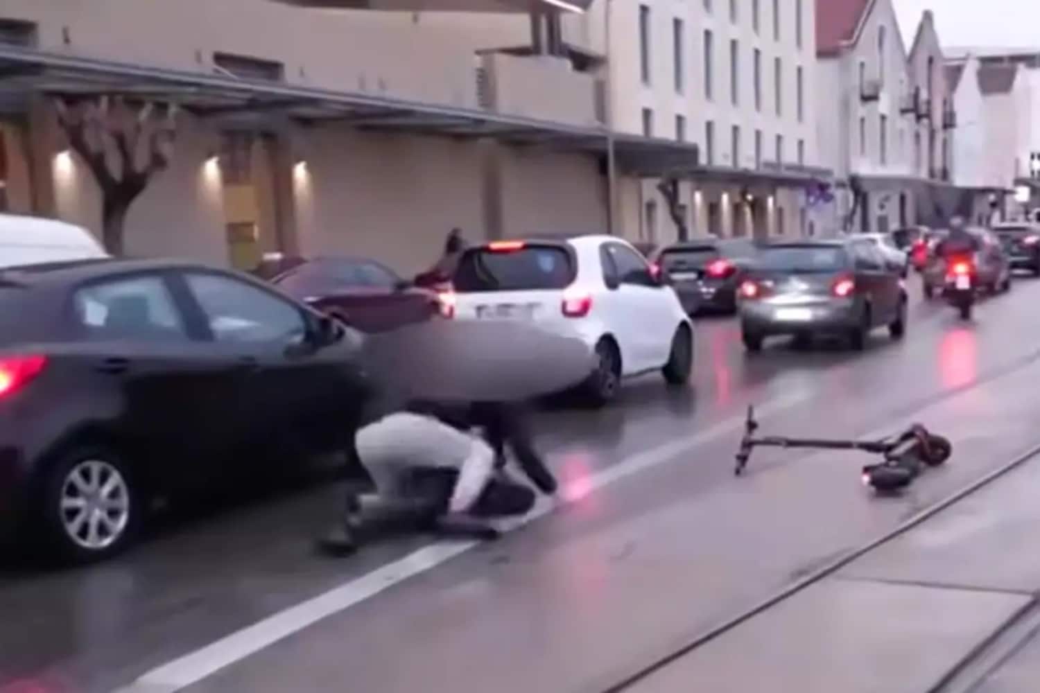 Όπως καταγράφηκε σε ζωντανή σύνδεση, η ρόδα του πατινιού σφήνωσε στις γραμμές του τρένου, με αποτέλεσμα να χάσουν τον έλεγχο και να πέσουν στο οδόστρωμα.