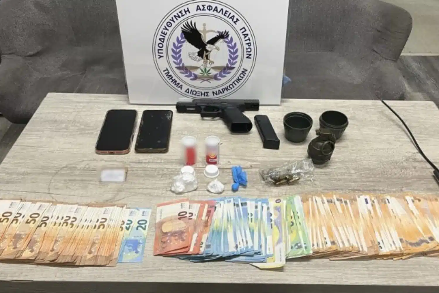 Επιπλέον, οι Aρχές εντόπισαν και κατέσχεσαν: 80,4 γραμμάρια κοκαΐνης, ένα πιστόλι με 29 φυσίγγια, χρηματικό ποσό ύψους 15.390 ευρώ, μια συσκευή γεωεντοπισμού (GPS) και κινητά τηλέφωνα.