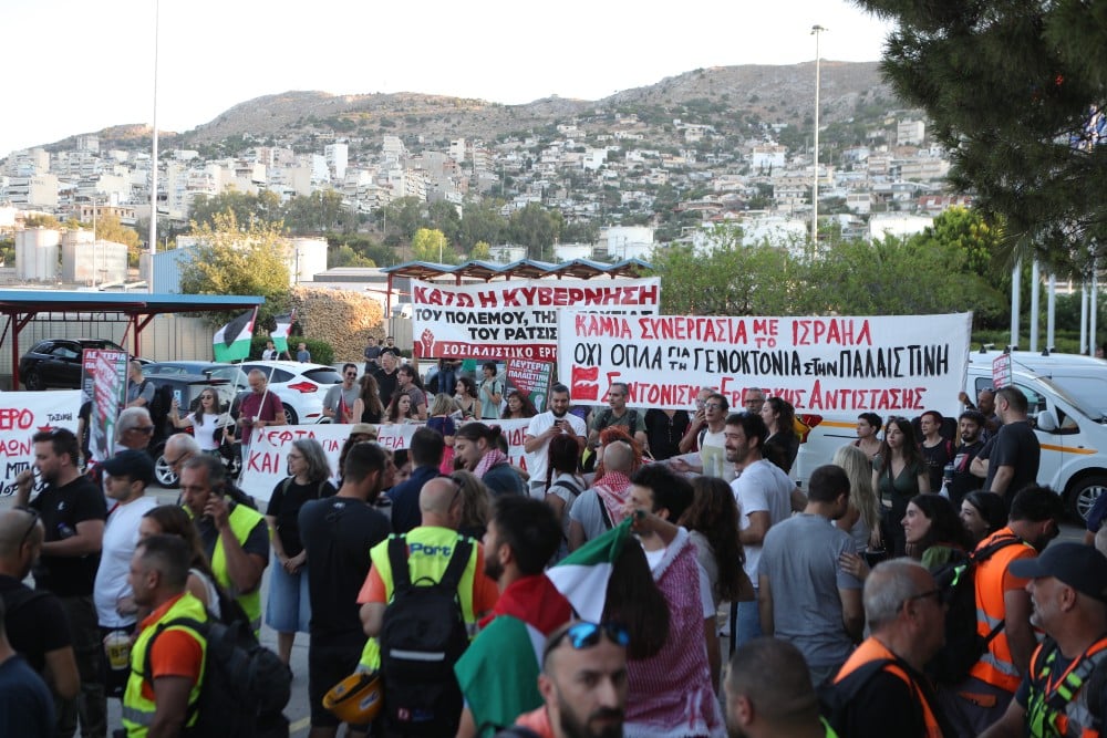 Μαζικό παρών δίνουν από τις 06:30 το πρωί της Δευτέρας (14/7) εκατοντάδες άνθρωποι στο λιμάνι του Πειραιά, ανταποκρινόμενοι στο κάλεσμα του σωματείου των λιμενεργατών, σε κινητοποίηση διαμαρτυρίας για την παρεμπόδιση εκφόρτωσης στρατιωτικού φορτίου με προορισμό το Ισραήλ.