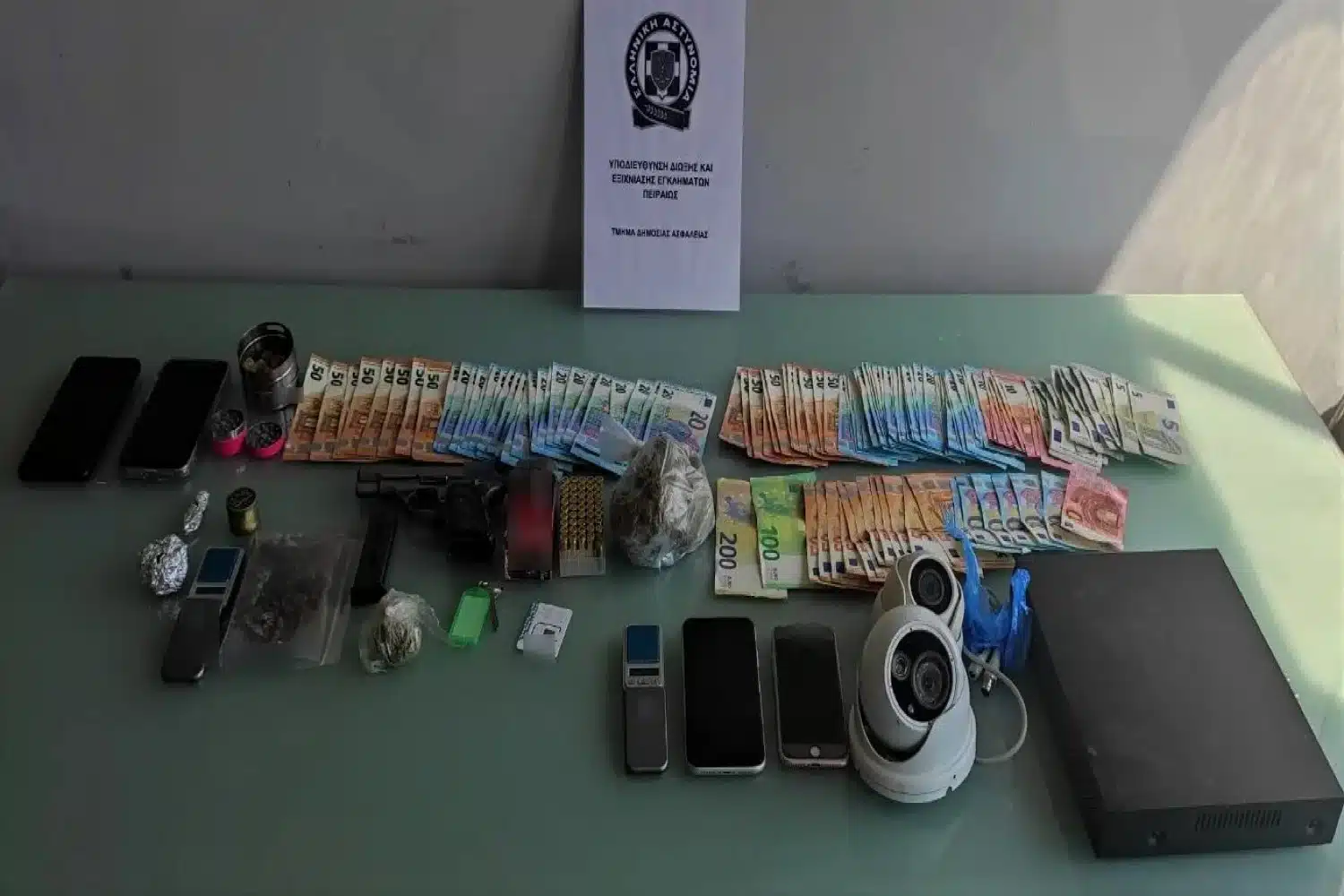 Κατασχέθηκαν, μεταξύ άλλων, πιστόλι, ποσότητες ακατέργαστης κάνναβης και μαριχουάνας(ΒΟΟΜ) και το χρηματικό ποσό των 3.740 ευρώ.