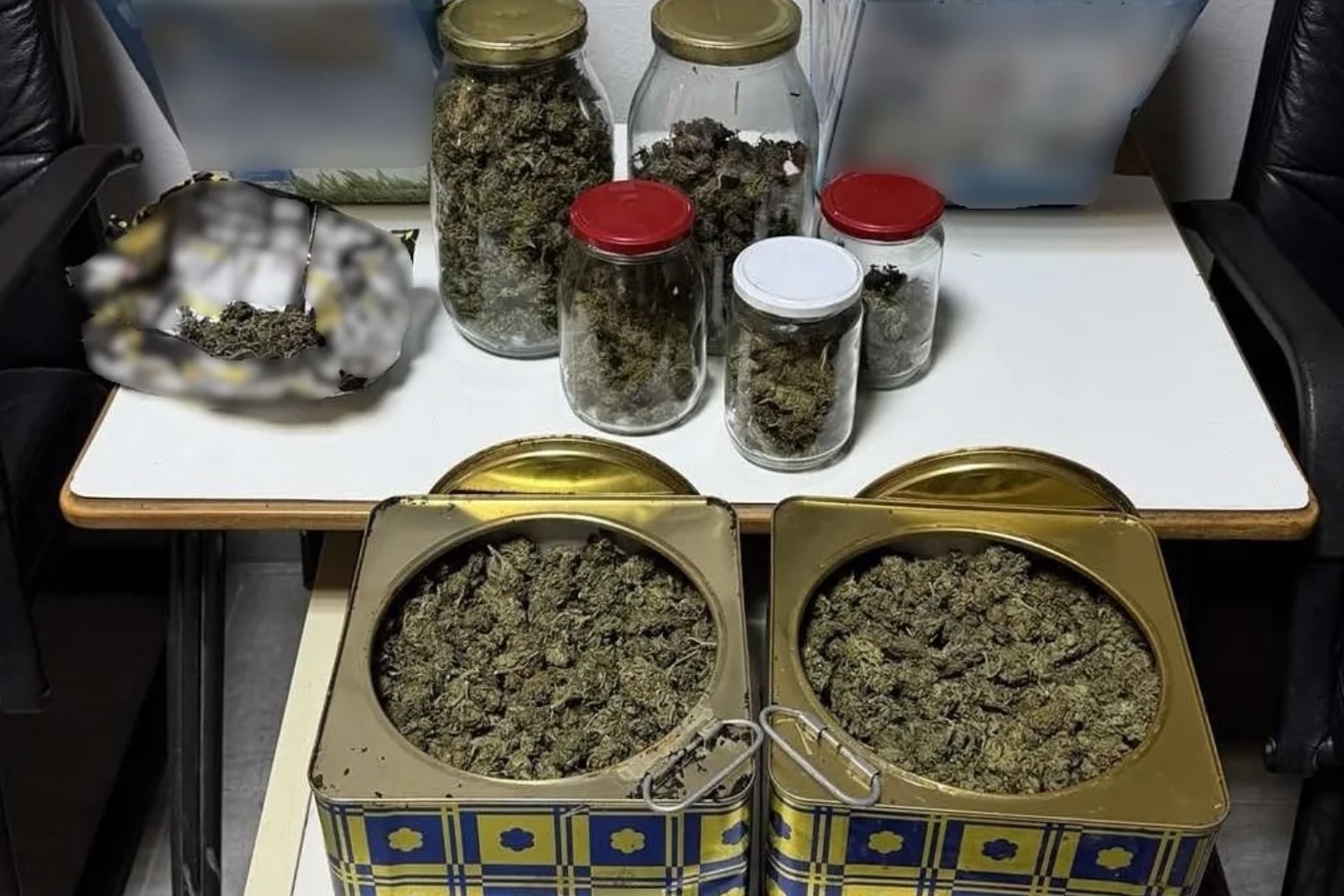Επιπλέον από την αυλή της οικίας του κατασχέθηκαν 4 μεταλλικά δοχεία και 5 γυάλινα βάζα, που περιείχαν ποσότητες ακατέργαστης κάνναβης, συνολικού βάρους 4 κιλών και 2 γραμμαρίων.