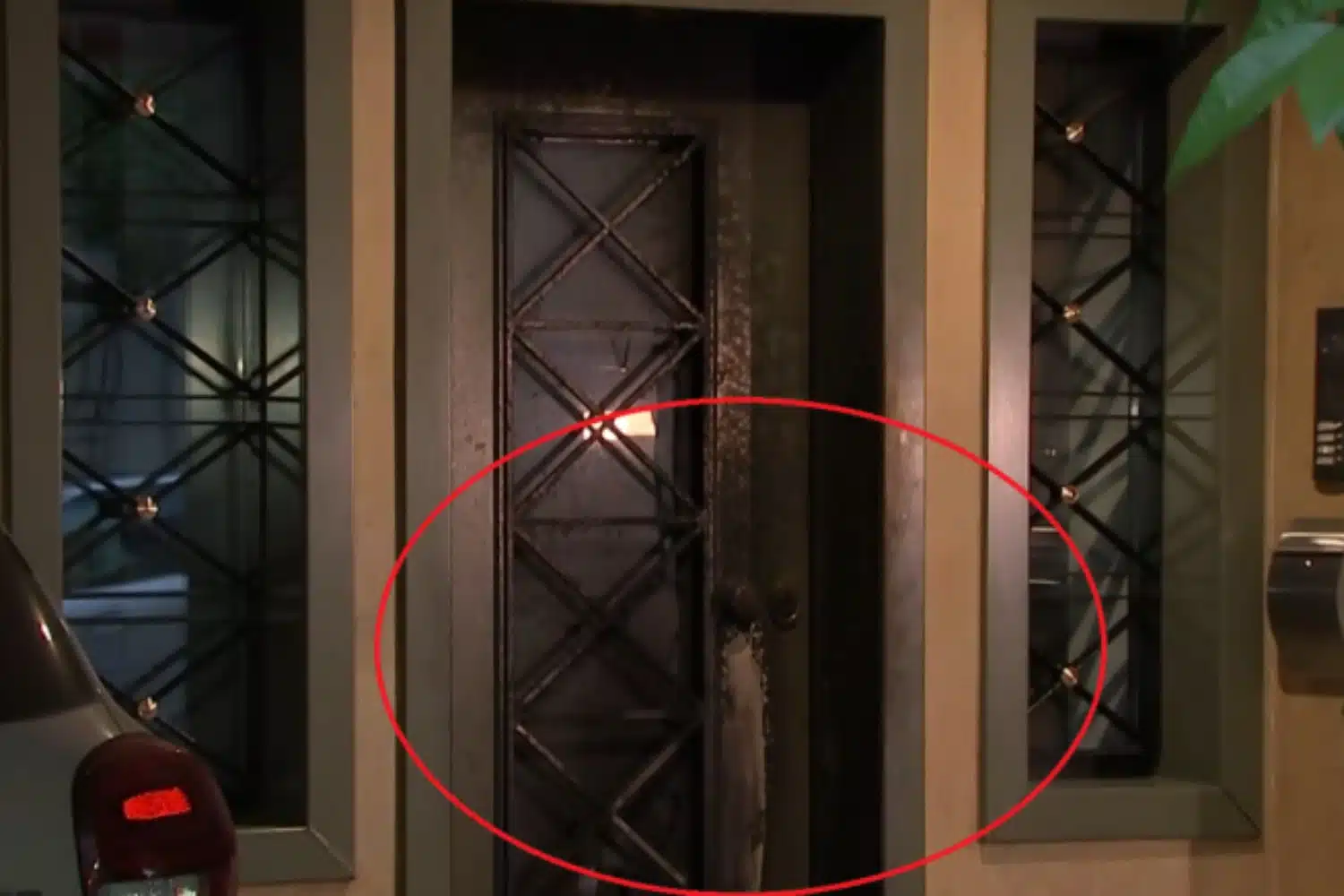 Από την έκρηξη που έγινε, προκλήθηκαν μόνο μικρής έκτασης υλικές ζημιές στην είσοδο της πολυκατοικίας.