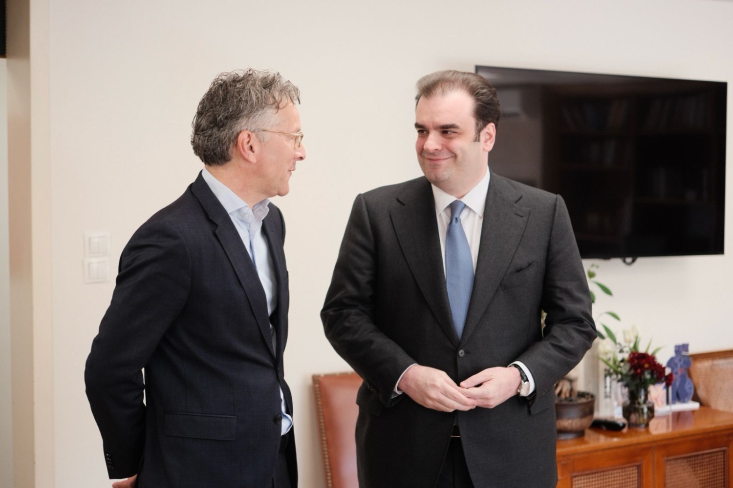 Κυριάκος Πιερρακάκης: Σήμερα είχα την ευκαιρία να υποδεχθώ τον Γερούν Ντάισελμπλουμ στην Ελλάδα και στο Υπουργείο Οικονομικών. Τον πρώην Πρόεδρο του Eurogroup, πρώην Υπουργό Οικονομικών της Ολλανδίας και Δήμαρχο του Αϊντχόβεν, μιας πόλης που ξεχωρίζει για τις δυνατότητές της στην τεχνολογία και την καινοτομία.