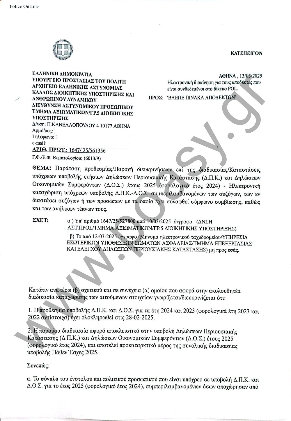 «Συναδέλφισσες, Συνάδελφοι, Σε συνέχεια του 305/6/28 από 11/03/2025 εγγράφου μας, σας ενημερώνουμε ότι δόθηκε παράταση της ηλεκτρονικής καταχώρησης των ΑΦΜ ανηλίκων τέκνων στο Πόθεν έσχες, έως την 31/03/2025 και παρακαλούμε για την ενημέρωση των μελών σας.»