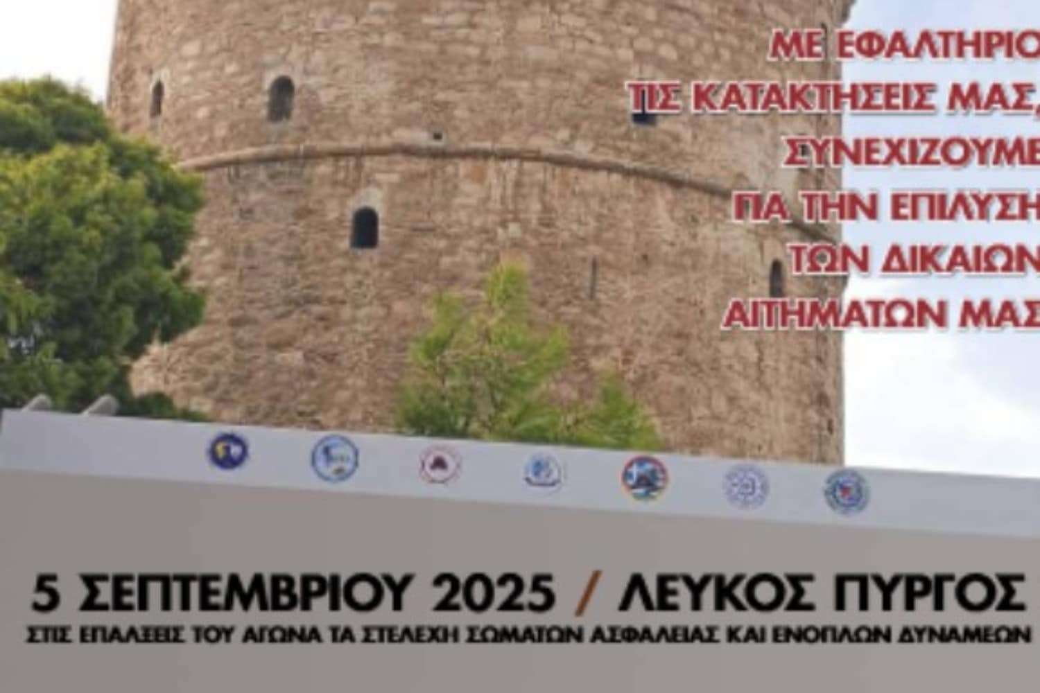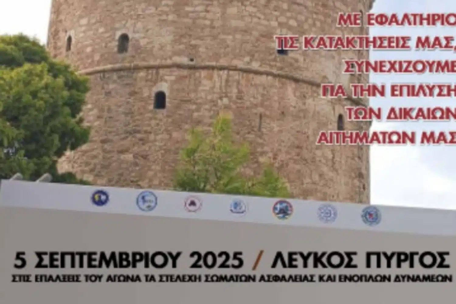 Μήνυμα ισχύος και ενότητας στέλνουν οι Ομοσπονδίες των Σωμάτων Ασφαλείας και των Ενόπλων Δυνάμεων, ανακοινώνοντας πανελλαδική συγκέντρωση διαμαρτυρίας την Παρασκευή (5/9), μπροστά από τον Λευκό Πύργο, με φόντο την έναρξη της ΔΕΘ και την παρουσία του Πρωθυπουργού.
