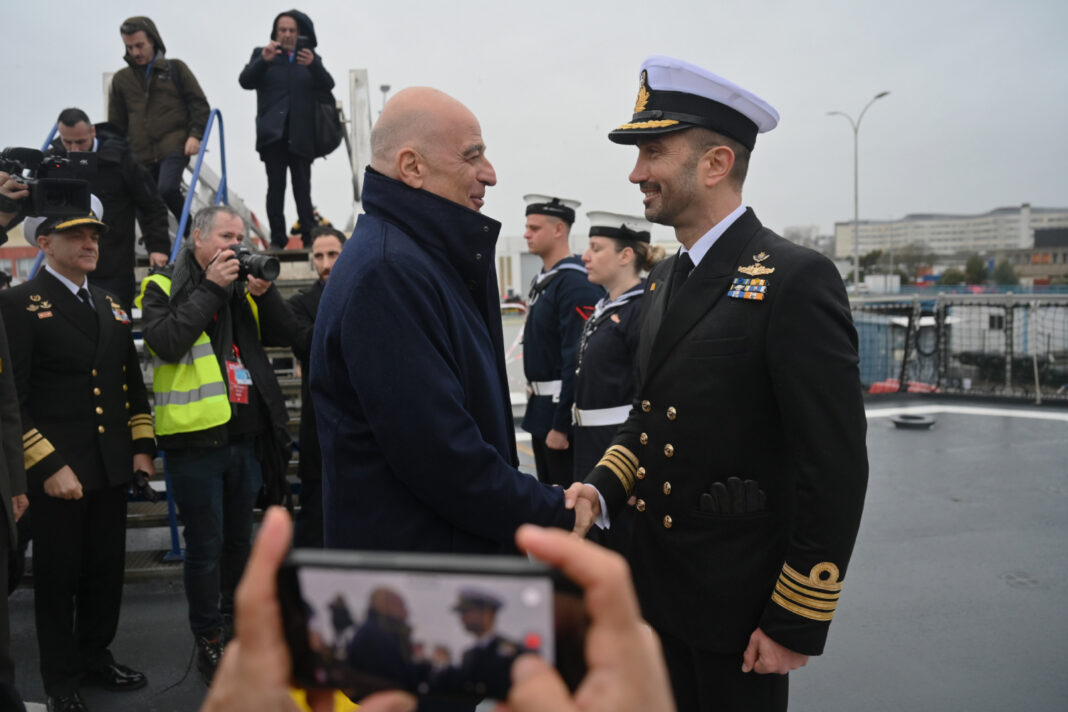 Η τελετή ύψωσης της ελληνικής σημαίας πραγματοποιήθηκε στην προβλήτα του ναυπηγείου της Naval Group, εκεί όπου η «ΚΙΜΩΝ» είχε ολοκληρώσει έναν απαιτητικό κύκλο ναυπήγησης και δοκιμών.