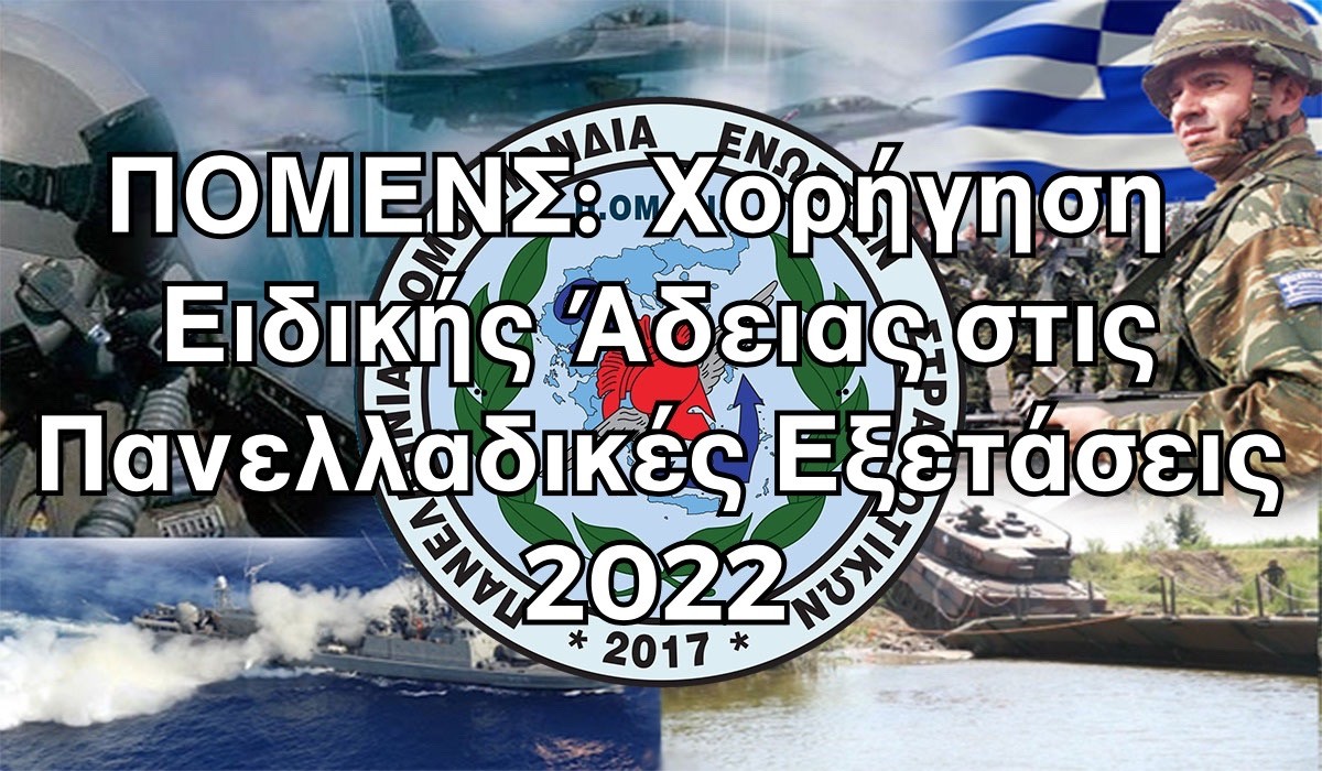 «Ως Πανελλήνια Ομοσπονδία Ενώσεων Στρατιωτικών-Π.ΟΜ.ΕΝ.Σ., κατόπιν σχετικής επιστολής της Ένωσης Στρατιωτικών Περιφερειακής Ενότητας Ρόδου (ΕΣΠΕΕΡ), σας καλούμε όπως εξετάσετε τη δυνατότητα χορήγησης ειδικής αδείας, πέραν των προβλεπομένων, στις/στους συναδέλφους μας, οι οποίες/οποίοι έχουν τέκνα τα οποία θα συμμετάσχουν στις υπόψη Πανελλαδικές Εξετάσεις, έτσι ώστε να παρέχουν συναισθηματική και ψυχολογική στήριξη στα παιδιά τους», σημειώνεται στην ανακοίνωση.