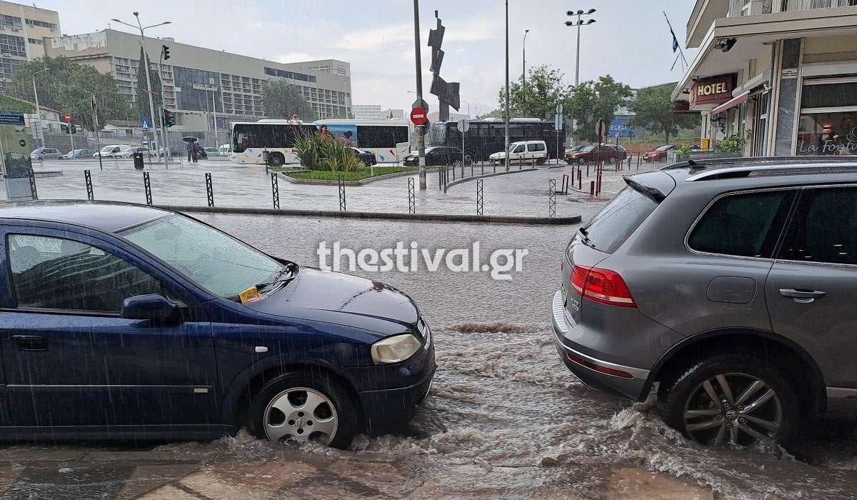 Ποτάμια θυμίζουν οι δρόμοι στο κέντρο της Θεσσαλονίκης μετά το πέρασμα της καταιγίδας σήμερα νωρίς το μεσημέρι που διήρκεσε για ελάχιστη ώρα.