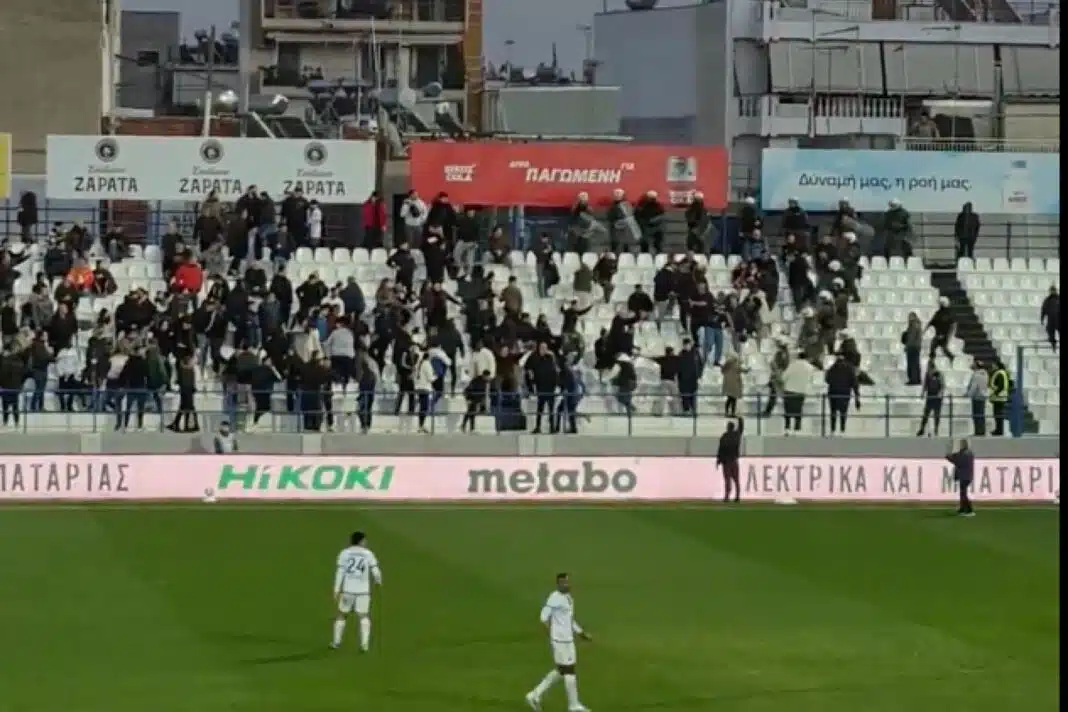 Ξαφνικά εισέβαλαν στο γήπεδο οπαδοί του Ιωνικού και άρχισαν να πετούν καθίσματα στους αστυνομικούς.