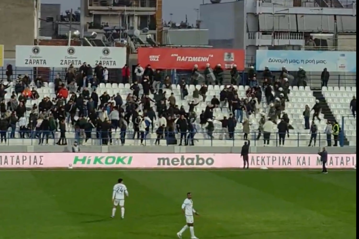 Ξαφνικά εισέβαλαν στο γήπεδο οπαδοί του Ιωνικού και άρχισαν να πετούν καθίσματα στους αστυνομικούς.