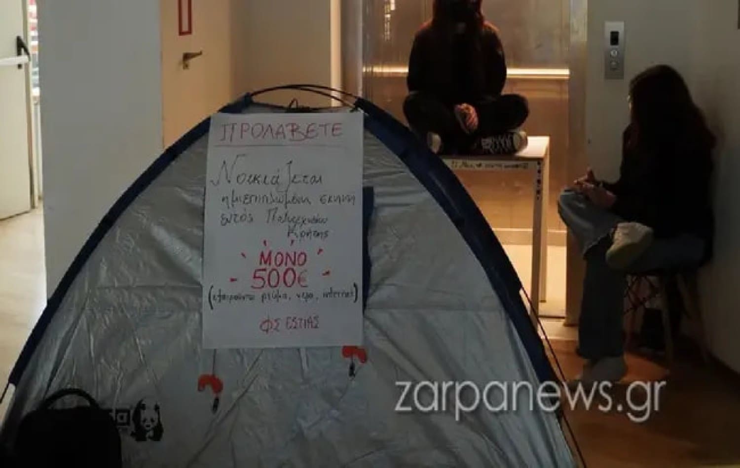 «Προλάβετε: Νοικιάζεται ημιεπιπλωμένη σκηνή εντός του Πολυτεχνείου, μόνο 500 ευρώ, εξαιρούνται ρεύμα, νερό και ίντερνετ», ήταν το «μήνυμα» των φοιτητών πάνω σε μία σκηνή.