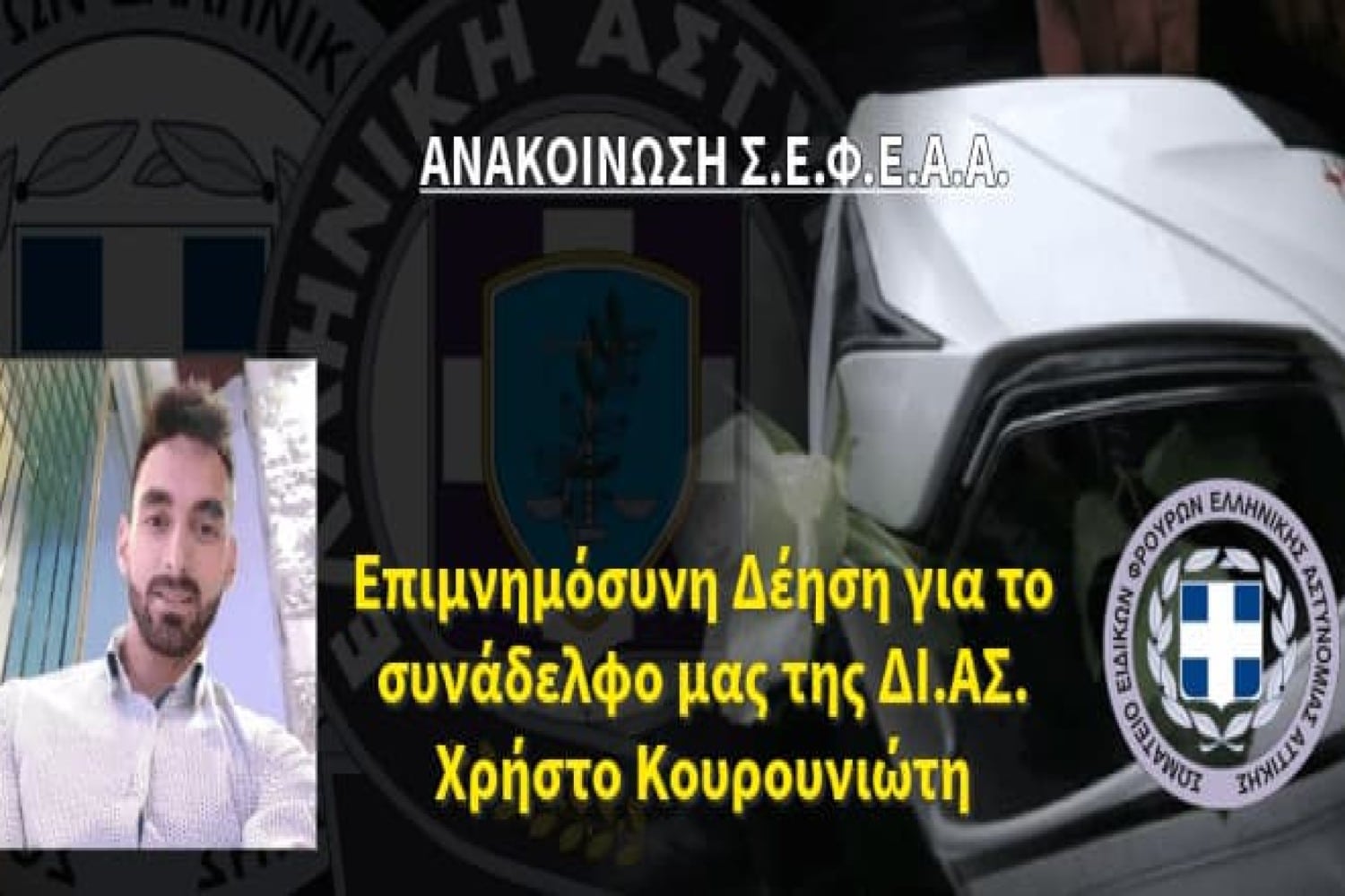 Το Σ.Ε.Φ.Ε.Α.Α. ανακοινώνει ότι την Τετάρτη 18-12-2024 και ώρα 12.00 το μεσημέρι θα τελεστεί Επιμνημόσυνη Δέηση υπέρ αναπαύσεως της ψυχής του συναδέλφου μας της ομάδας ΔΙ.ΑΣ. ΚΟΥΡΟΥΝΙΩΤΗ Χρήστου, ο οποίος έπεσε εν ώρα καθήκοντος πριν από ένα έτος, κατά τη διάρκεια καταδίωξης, υπερασπιζόμενος το αγαθό της έννομης τάξης.