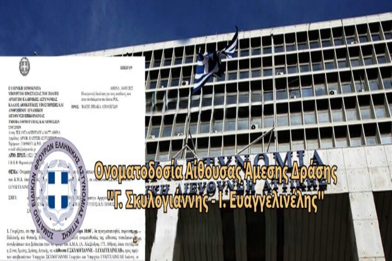 Το Σωματείο Ειδικών Φρουρών Ελληνικής Αστυνομίας Αττικής (ΣΕΦΕΑΑ) με ιδιαίτερη συγκίνηση και υπερηφάνεια ανακοινώνει την απόφαση του Υπουργού Προστασίας του Πολίτη, Μιχάλη Χρυσοχοΐδη, για την ονοματοδοσία της αίθουσας συγκεντρώσεων προσωπικού, της Άμεσης Δράσης Αττικής εις μνήμην των ηρωικών συναδέλφων μας, Γιώργου Σκυλογιάννη και Ιωάννη Ευαγγελινέλη, οι οποίοι έπεσαν εν ώρα καθήκοντος, υπερασπιζόμενοι με θάρρος και αυτοθυσία τις αξίες της Ελληνικής Αστυνομίας και της κοινωνίας που υπηρετούσαν.