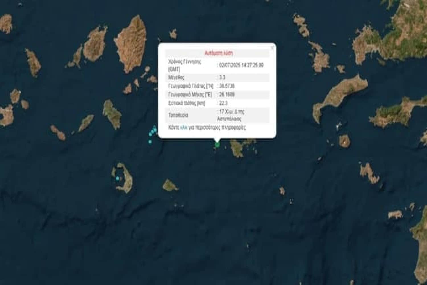 Σεισμός 3,3 βαθμών της κλίμακας Ρίχτερ σημειώθηκε το μεσημέρι της Τρίτης (2/7) 17χλμ δυτικά της Αστυπάλαιας.