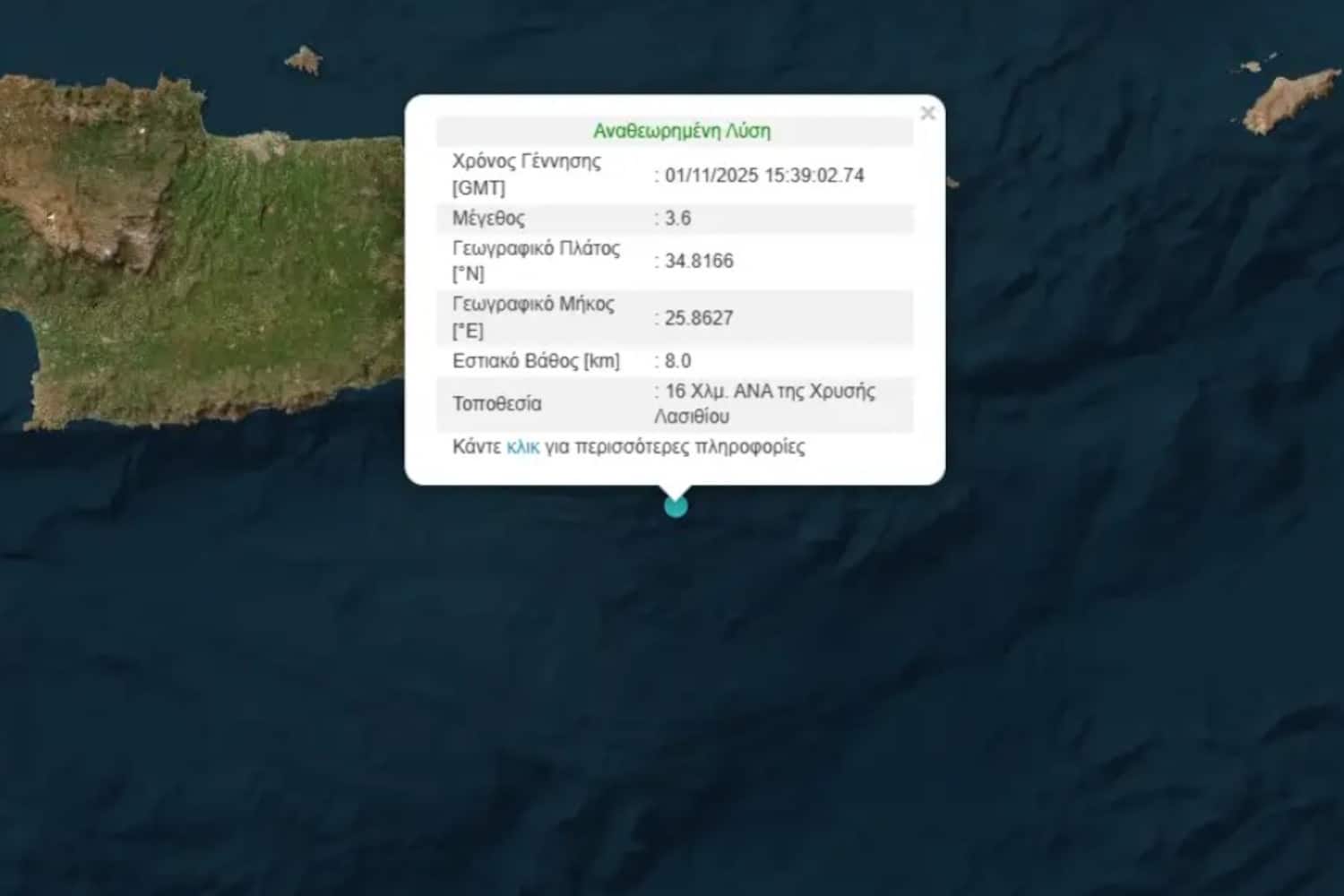 Σεισμός μεγέθους 3,6 βαθμών της κλίμακας Ρίχτερ νότια από το Λασίθι σημειώθηκε στις 5:39 το απόγευμα του Σαββάτου (01.11.2025).