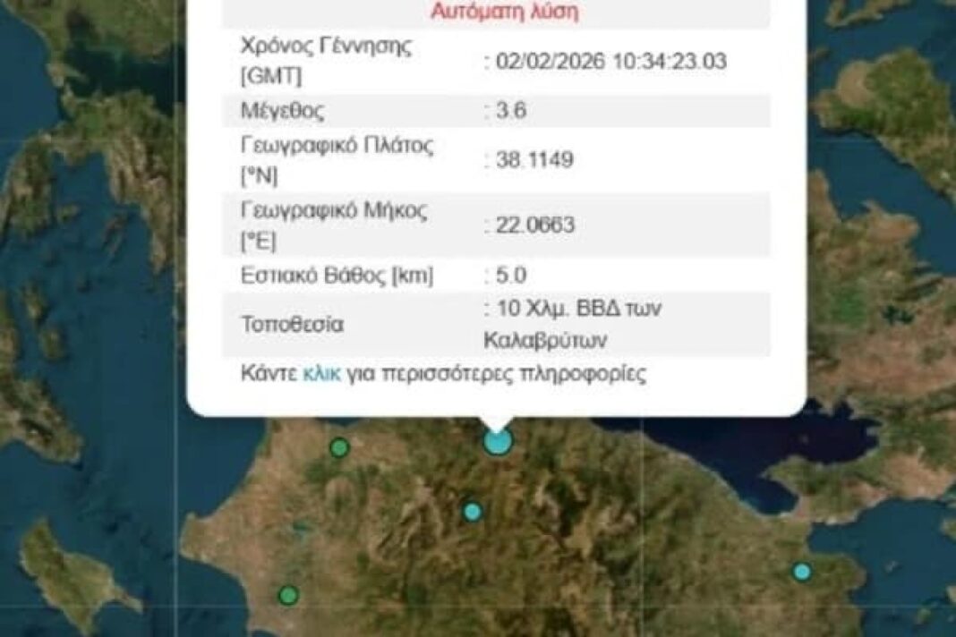 Σεισμός σημειώθηκε σήμερα (2/2) στα Καλάβρυτα, λίγο μετά τις 12:30 το μεσημέρι, σύμφωνα με την προκαταρκτική μέτρηση του Γεωδυναμικού Ινστιτούτου.