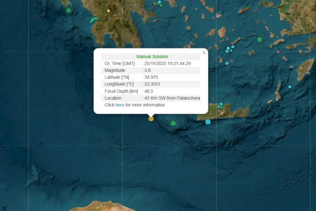 Ειδικότερα, ο σεισμός των 3,8 Ρίχτερ προέρχεται από τον θαλάσσιο εστιακό χώρο που βρίσκεται σε απόσταση 37 χιλιομέτρων νοτιοδυτικά της Παλαιοχώρας στα Χανιά.