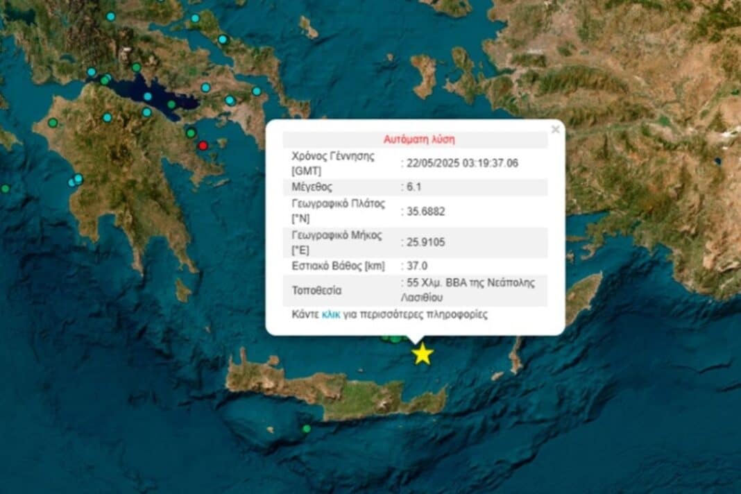 Σεισμός 6,1 βαθμών της Κλίμακας Ρίχτερ – σύμφωνα με την αυτόματη λύση του Γεωδυναμικού Ινστιτούτου – έγινε στις 6:19 το πρωί της Πέμπτης (22/5) στον θαλάσσιο χώρο βόρεια της Κρήτης.