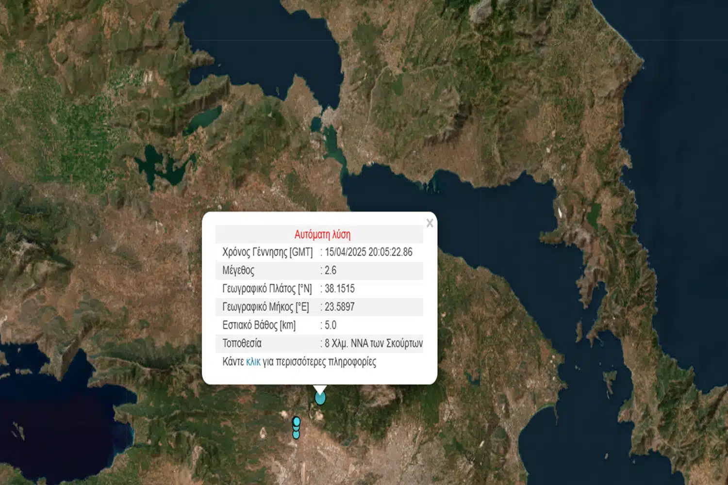 Σύμφωνα με το Γεωδυναμικό Ινστιτούτο Αθηνών και την αυτόματη λύση ο σεισμός είχε εστιακό βάθος 5 χλμ.