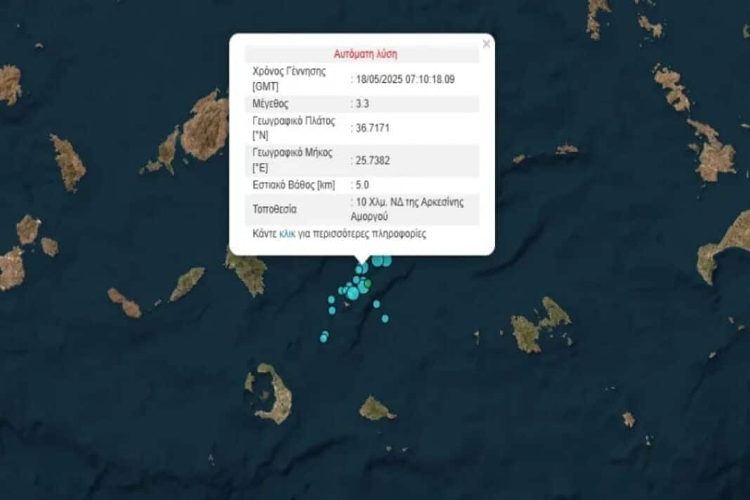 Σεισμός μεγέθους 3,3 της κλίμακας Ρίχτερ σημειώθηκε στην Αμοργό το πρωί της Κυριακής 18 Μαΐου.