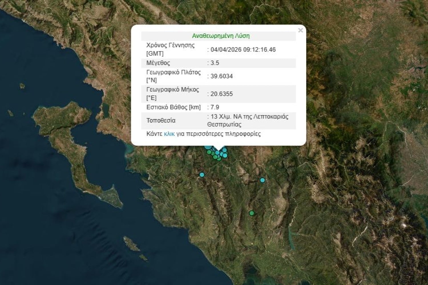 Ο σημερινός σεισμός είχε μέγεθος 3,5 βαθμών της κλίμακας Ρίχτερ και σημειώθηκε 13 χιλιόμετρα νοτιοανατολικά της Λεπτοκαριάς Θεσπρωτίας.