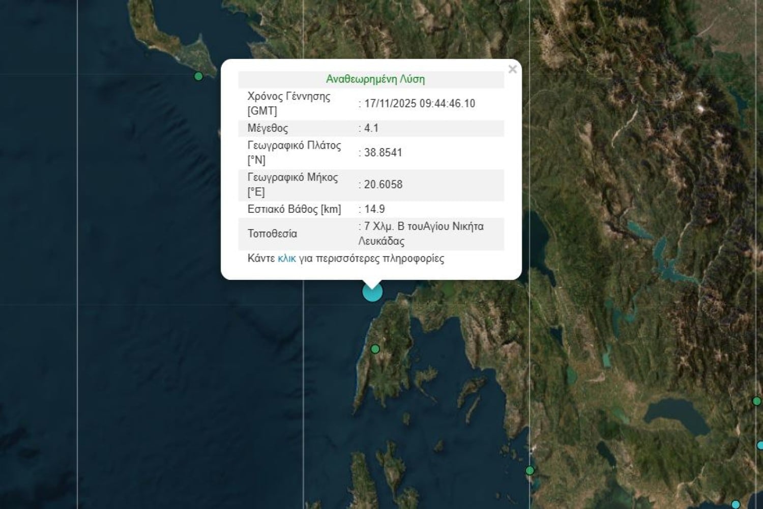 Από την πλευρά του το Γεωδυναμικό Ινστιτούτο Αθηνών σημείωσε ότι ο σεισμός είχε εστιακό βάθος 14,9 χιλιόμετρα και έγινε 7 χιλιόμετρα βόρεια του Αγίου Νικήτα Λευκάδας.