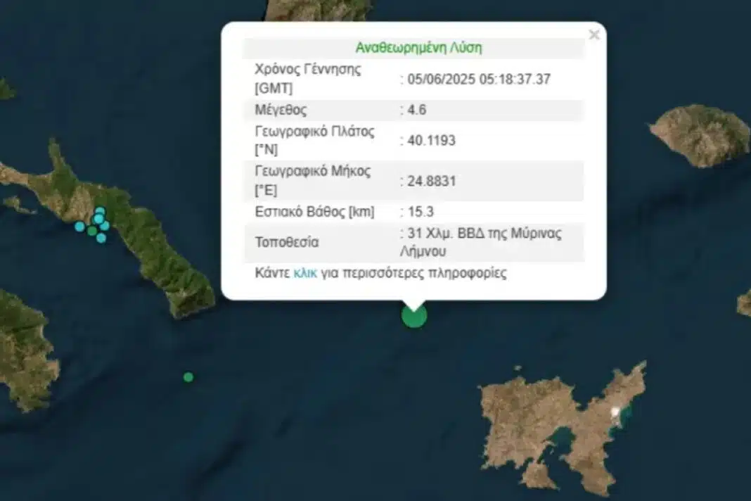 Ο σεισμός που σημειώθηκε στις 8:18 το πρωί, είχε επίκεντρο τη θαλάσσια περιοχή 31 χλμ. βόρεια-βορειοδυτικά της Μύρινας.