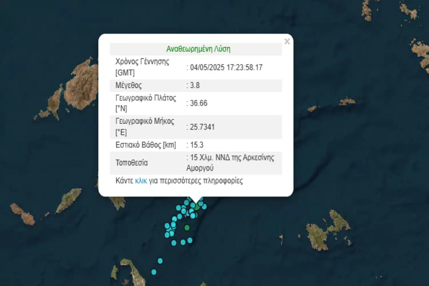 Σύμφωνα με το Γεωδυναμικό Ινστιτούτο, το επίκεντρο του σεισμού εντοπίζεται στα 15 χιλιόμετρα νότια – νοτιοδυτικά της Αρκεσίνης Αμοργού.