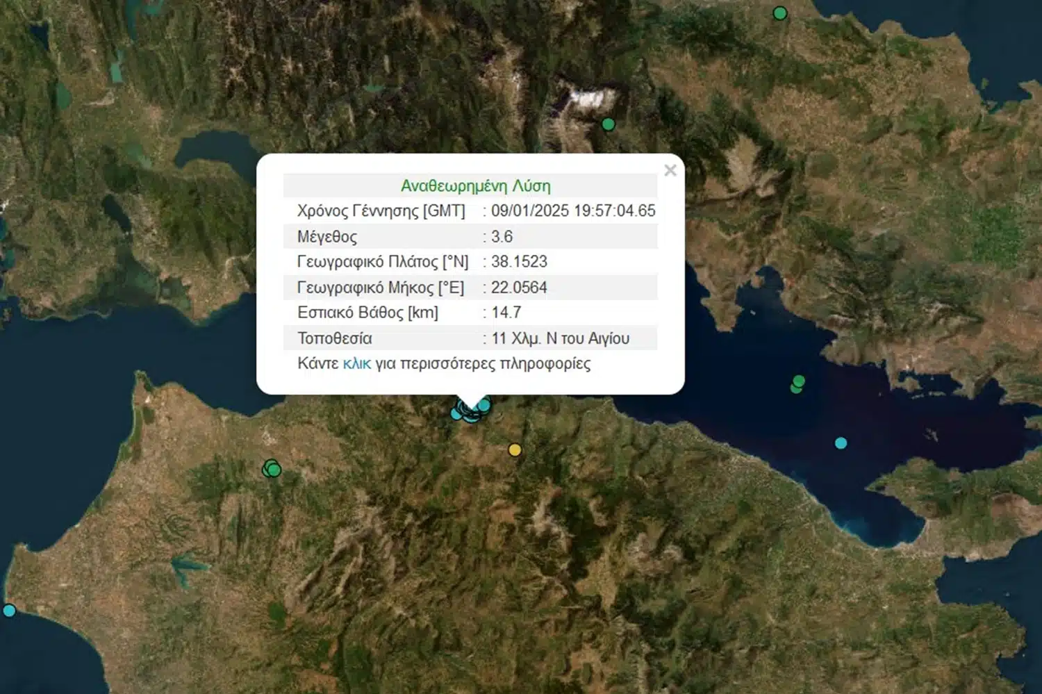 Σύμφωνα με το Γεωδυναμικό Ινστιτούτο, η δόνηση ήταν μεγέθους 3,6 Ρίχτερ με το επίκεντρο να εντοπίζεται 11 χιλιόμετρα νότια του Αιγίου.