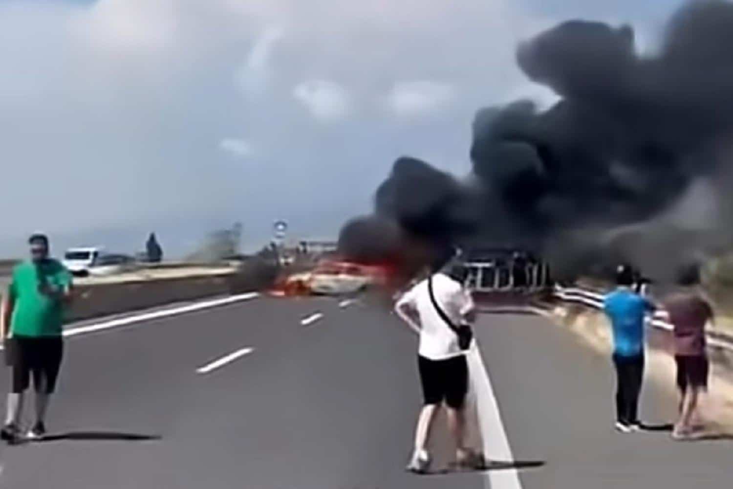 Ο 36χρονος σύζυγός της, που προσπάθησε να απεγκλωβίσει τη 49χρονη από το φλεγόμενο αυτοκίνητο, φέρει εγκαύματα στα χέρια, τα οποία αντιμετωπίζονται στη χειρουργική κλινική όπου νοσηλεύεται.