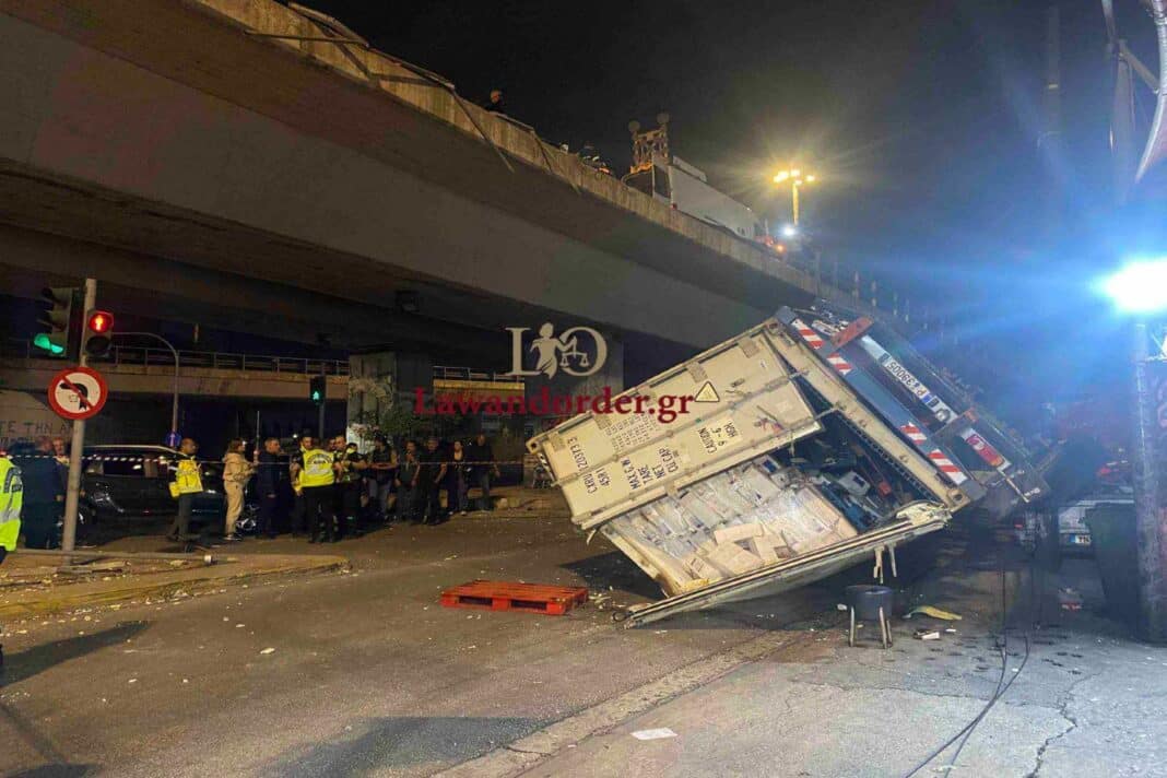 Συγκεκριμένα, φορτηγό έπεσε λίγο μετά τις 19:30 το απόγευμα από τη γέφυρα στην Πέτρου Ράλλη και κατέληξε στη Θηβών.