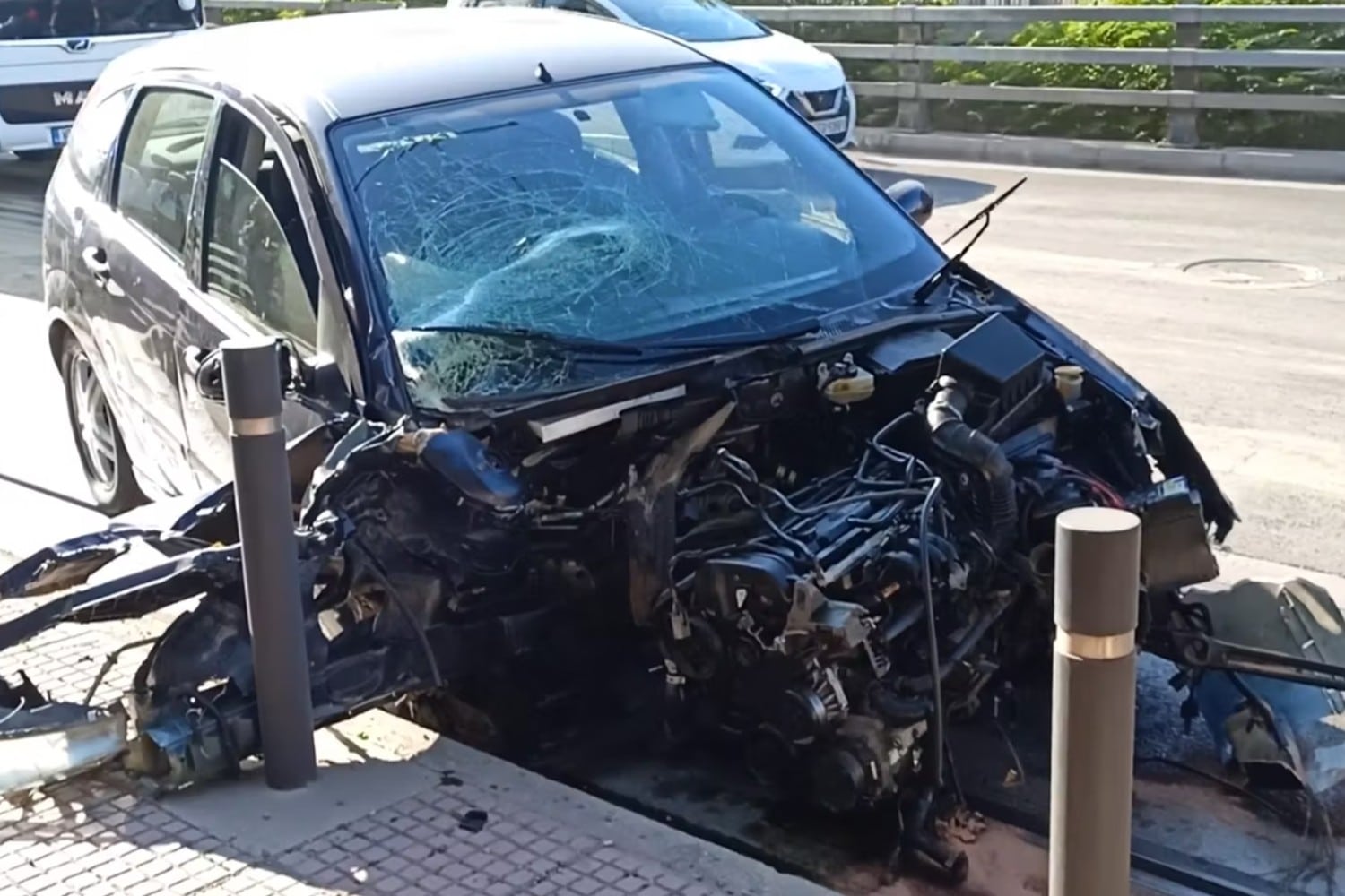 Για δεκάδες μέτρα, οι γραμμές του Τραμ -ανάμεσα στις στάσεις του γηπέδου «Καραϊσκάκης» και της «Μικράς Ασίας»- είχαν γεμίσει με συντρίμμια από το αυτοκίνητο (λάστιχα, ζάντες, κομμάτια από τη μηχανή, πλαστικά).