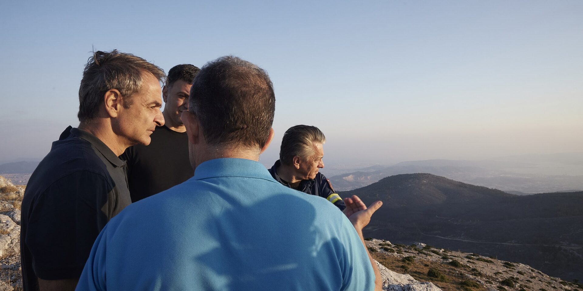 Τον κ. Μητσοτάκη συνόδευαν ο Υπουργός Κλιματικής Κρίσης και Πολιτικής Προστασίας Βασίλης Κικίλιας, ο Γενικός Γραμματέας Πολιτικής Προστασίας Βασίλης Παπαγεωργίου, ο Επιτελάρχης του Πυροσβεστικού Σώματος, Αντιστράτηγος Χρήστος Λάμπρης και ο Γενικός Διευθυντής Δασών και Δασικού Περιβάλλοντος του ΥΠΕΝ Βαγγέλης Γκουντούφας, με τους οποίους συζήτησε τα έργα που υλοποιήθηκαν και υλοποιούνται για τη διεύρυνση των αντιπυρικών ζωνών που είχαν δημιουργηθεί πριν την έναρξη της αντιπυρικής περιόδου και την περαιτέρω ενίσχυση των μέτρων προστασίας.