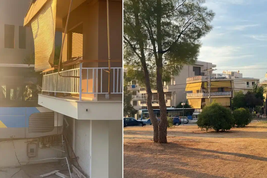Από την ισχυρή πρόσκρουση υπέστησαν εκτεταμένες ζημιές το μπαλκόνι, το ισόγειο, η μάντρα και η αυλή του κτιρίου, καθώς και το παρκαρισμένο όχημα.
