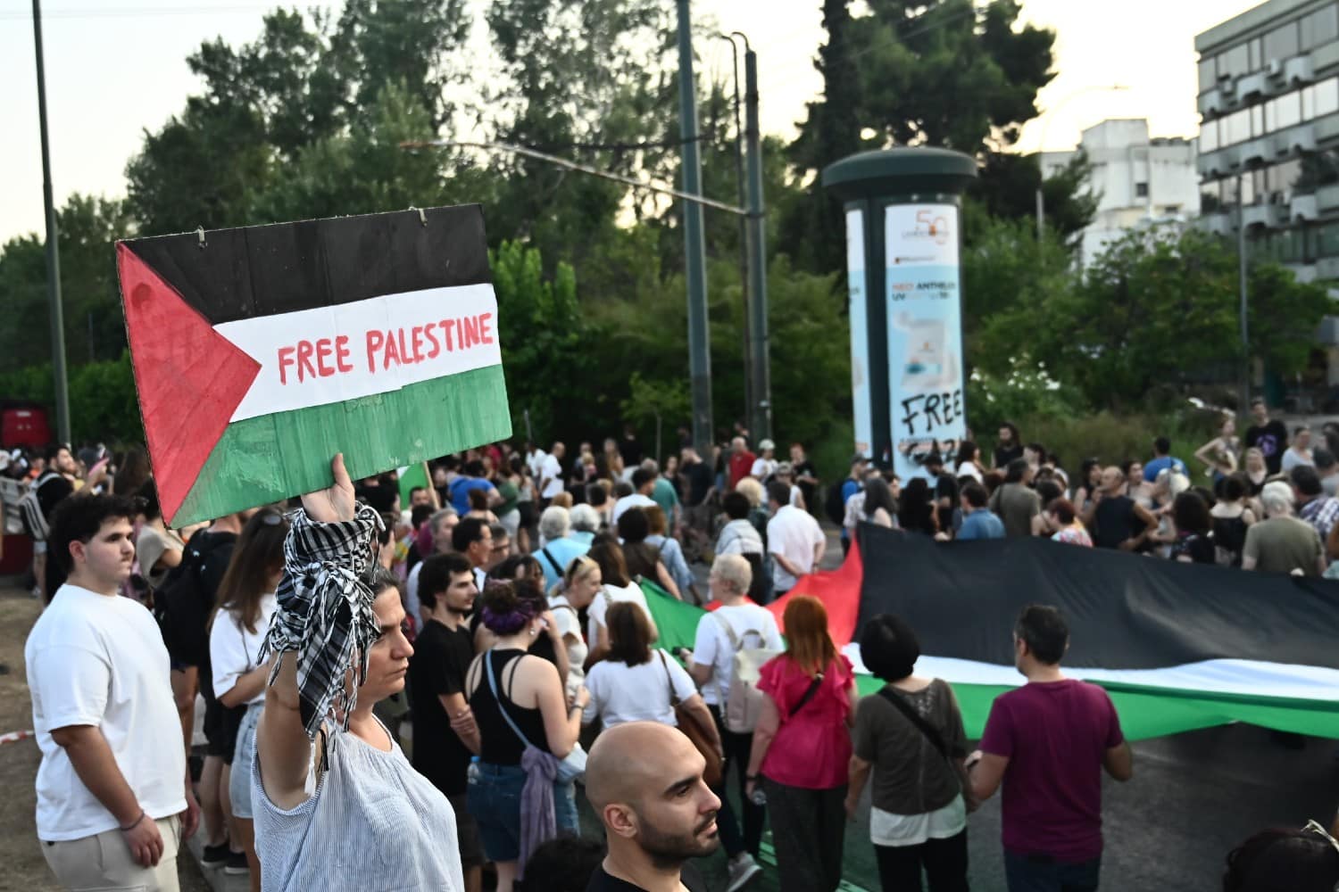 Οι συγκεντρωμένοι έφτασαν στην πρεσβεία με πορεία και φωνάζουν συνθήματα υπέρ της Παλαιστίνης και ενάντια στους βομβαρδισμούς στη Λωρίδα και την κράτηση των 12 επιβαινόντων του Madleen.