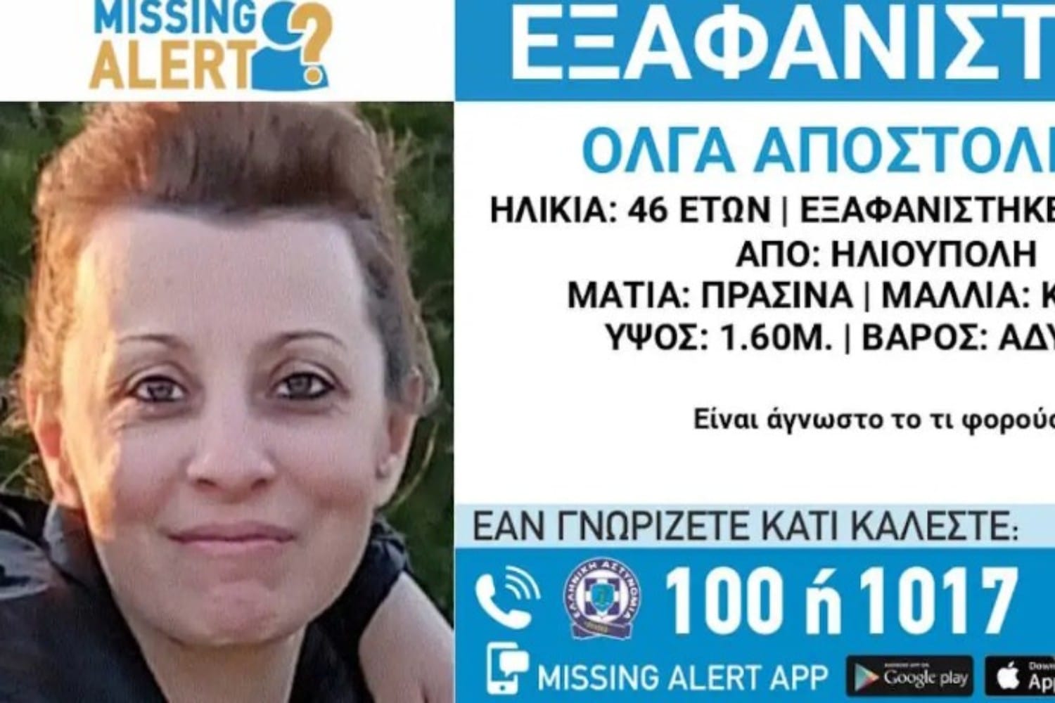 «Η Αποστολίδου Όλγα έχει ύψος 1,60 μ., είναι αδύνατη, έχει πράσινα μάτια και καστανά μαλλιά. Δεν γνωρίζουμε τι φορούσε την ημέρα που εξαφανίστηκε. Οποιοσδήποτε έχει κάποια πληροφορία, παρακαλείται να επικοινωνήσει τηλεφωνικά με ”Το Χαμόγελο του Παιδιού” όλο το 24ωρο, στην ”Εθνική Γραμμή για τους Αγνοούμενους Ενήλικες – 1017”, σε όλα τα Αστυνομικά Τμήματα της χώρας, αλλά και μέσω της εφαρμογής Missing Alert app όπου υπάρχει ζωντανή ενημέρωση για την εξαφάνιση».
