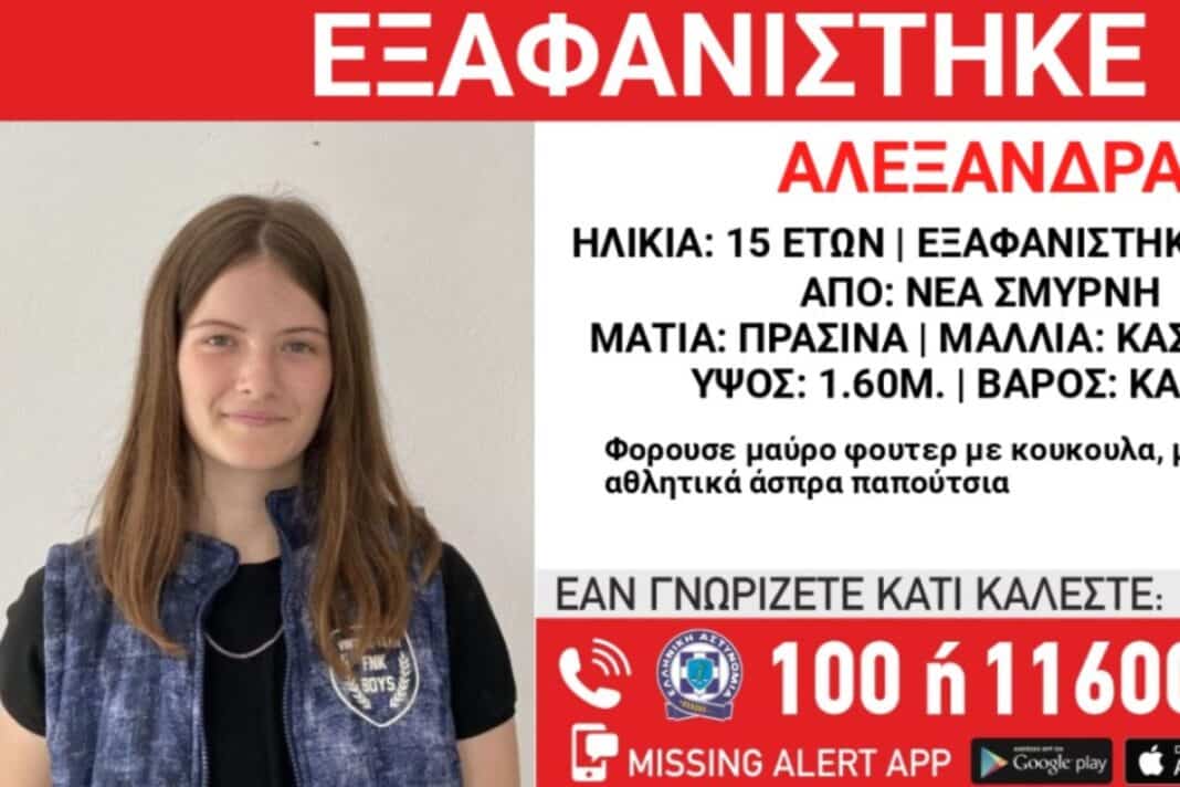 Στις 10/03/2025, μεσημεριανές ώρες, εξαφανίστηκε από χώρο παιδικής προστασίας στην περιοχή της Νέας Σμύρνης, η Αλεξάνδρα Γ. 15 ετών.